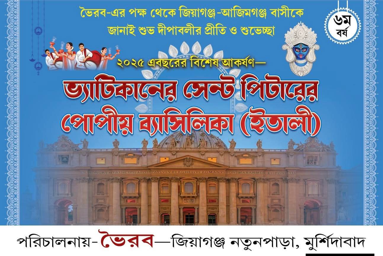 Spread the love জিয়াগঞ্জ, মুর্শিদাবাদ : দুর্গোৎসব শেষ করে ফের কালী পুজোর দিন গুনছে এখন সমগ্র জিয়াগঞ্জ আজিগঞ্জ পৌর এলাকাবাসী। এরই মধ্যে আলোচনায় উঠে এসেছে জিয়াগঞ্জ বেগমগঞ্জ নতুন পাড়া শ্রী শ্রী ভৈরব কালী পুজো। ষষ্ঠ বর্ষে পদার্পণ করা এই পুজোর এবারের থিম ইতালির বিখ্যাত “ভার্টিকান সিটি’র সেন্ট পিটারের পোপিয় ব্যাসিলিকা”। আন্তর্জাতিক স্থাপত্যের অনুপ্রেরণায় তৈরি এই মণ্ডপসজ্জা ইতিমধ্যেই এলাকাবাসীর আগ্রহের কেন্দ্রবিন্দুতে। পুজো উদ্যোক্তাদের বক্তব্য, প্রতিবছরই তাঁরা কিছু আলাদা ও নান্দনিক কিছু উপহার দিতে চেষ্টা করেন দর্শনার্থীদের। এবারে বিদেশি স্থাপত্যরীতি অনুসরণ করে এমন এক শিল্পকর্ম গড়ে তোলা হয়েছে যা কেবল পুজোর মণ্ডপ নয়, এক অপূর্ব শিল্পনির্মাণ। মণ্ডপ নির্মাণে স্থানীয় কারিগরদের সঙ্গে যুক্ত রয়েছেন দক্ষ শিল্পীর দল। দিনরাত এক করে তাঁরা ফুটিয়ে তুলছেন ইতালির সেই ঐতিহাসিক ব্যাসিলিকার প্রতিরূপ। স্থানীয় বাসিন্দারা জানিয়েছেন, “এত সুন্দর ও ভিন্নধর্মী মণ্ডপ আগে কখনও দেখা যায়নি। প্রতি বছর বেগমগঞ্জ নতুন পাড়া নতুন কিছু করে দেখায়, এবারে তারা যেন একেবারে বিশ্বমঞ্চে পা রাখলো।” পুজো কমিটির সদস্যদের মতে, ধর্মীয় ভাবনা ও শিল্পের সমন্বয়ে এই বছর তাঁরা এক অভিনব বার্তা দিতে চাইছেন— “ভক্তি, ঐক্য ও সৌন্দর্যের মেলবন্ধনই প্রকৃত উৎসব।” আগামী কয়েকদিনের মধ্যেই মণ্ডপের কাজ চূড়ান্ত পর্যায়ে পৌঁছাবে। আলোসজ্জা, প্রতিমা নির্মাণ ও সংগীত পরিবেশনার প্রস্তুতিও জোরকদমে চলছে। ফলে বলা যায়, ষষ্ঠ বর্ষের এই ভৈরব কালী পুজো এবার জিয়াগঞ্জের পুজো পরিক্রমায় অন্যতম আকর্ষণ হতে চলেছে। জিয়াগঞ্জ থেকে সৌরভ আম্বলীর রিপোর্ট Post navigation প্রেমানন্দ মহারাজ এর কি হয়েছে। তিনি কি অসুস্থ? ভারতীয় ডাক পরিষেবা দিবস: চিঠির গন্ধে ভরা এক ঐতিহ্যের গল্প